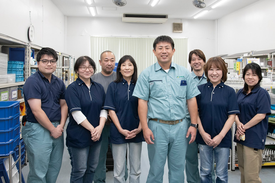 - 次は医療部品の検査と生産管理、サンドブラストのメンバーです。外観に厳しい医療部品で数百種類の加工を支えてくれています。