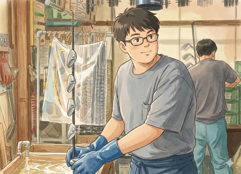 担当はめっき作業。タコ掛け(ラッキング)を得意とし、素材の形や重みを読み解きながら最適な掛け方を探る。地味に見える工程ほど品質を左右するが、彼はそこを丁寧に積み上げてきた。