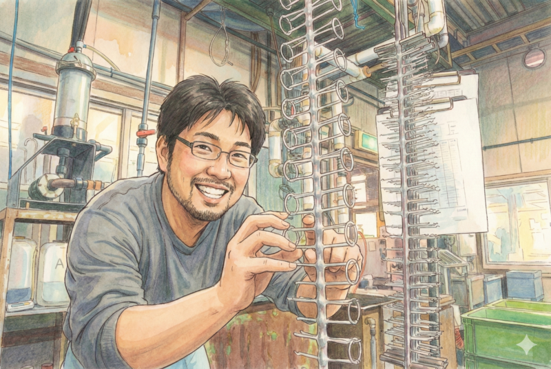 この10年間のアルファメックの技術的な躍進には、 すべて鈴木が関わってきたと言っても過言ではありません。 銅燻し加工液の自社建浴、 電気ニッケルめっきにおける外観不良対策としての電流密度変更など、 具体的な成果は枚挙にいとまがありません。